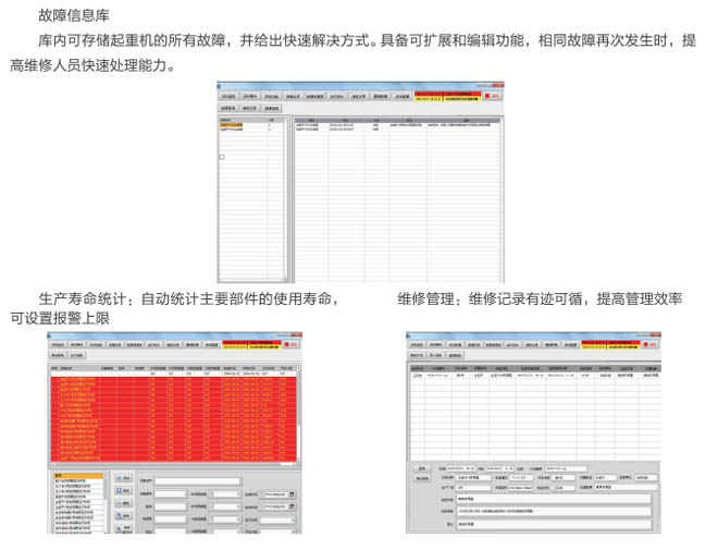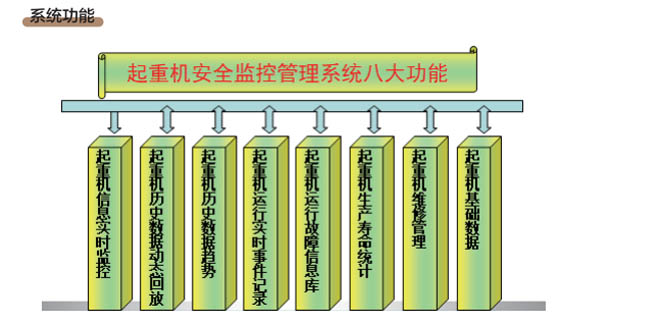•- 通過(guò)起重機(jī)安全監(jiān)控管理系統(tǒng),運(yùn)行管理人員可以通過(guò)系統(tǒng)對(duì)起重機(jī)運(yùn)行中出現(xiàn)的故障進(jìn)行 查詢(xún)和處理;對(duì)設(shè)備及元器件進(jìn)行系統(tǒng)管理;指導(dǎo)定期對(duì)系統(tǒng)進(jìn)行維修和調(diào)試。系統(tǒng)具備以 下功能:實(shí)時(shí)狀態(tài)顯示、實(shí)時(shí)報(bào)警顯示、歷史記錄查詢(xún)、部件壽命監(jiān)測(cè)、事故診斷分析、數(shù) 據(jù)統(tǒng)計(jì)及權(quán)限設(shè)定管理等。