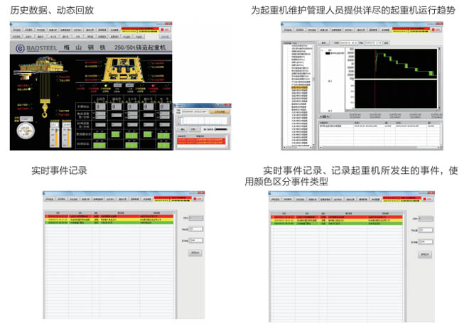 •-1、起重機(jī)狀態(tài)實(shí)時(shí)監(jiān)測(cè):對(duì)事故易發(fā)設(shè)備和重點(diǎn)關(guān)鍵設(shè)備的運(yùn)行情況進(jìn)行實(shí)時(shí)監(jiān)測(cè),同時(shí) 對(duì)采集的數(shù)據(jù)進(jìn)行分析整理,并把現(xiàn)場(chǎng)的實(shí)際數(shù)據(jù)與相關(guān)的設(shè)備運(yùn)行指標(biāo)進(jìn)行對(duì)比,超過(guò)偏 差限制時(shí)產(chǎn)生報(bào)警信息并存儲(chǔ)報(bào)警記錄。共享相關(guān)數(shù)據(jù),為及時(shí)發(fā)現(xiàn)和消除設(shè)備故障隱患提 供必要的數(shù)據(jù)支持。
