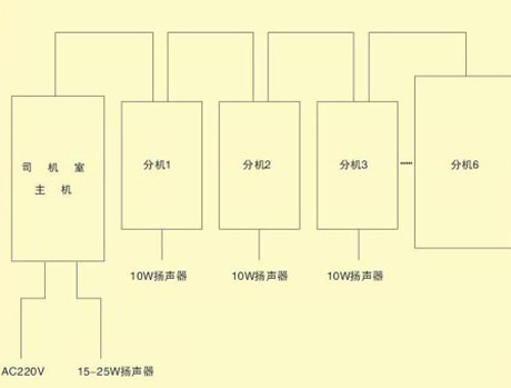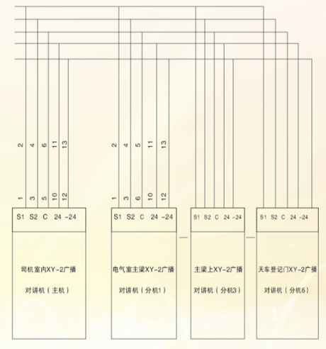 XY―2型系列產(chǎn)品廣泛應(yīng)用于冶金、電力等行業(yè)的有線對(duì)講系統(tǒng),在天車上其主站安裝在司機(jī)室,分站可以分布在電力室內(nèi)、高壓室、大小車上和天車登機(jī)門。該系統(tǒng)由若干臺(tái)廣播對(duì)講機(jī)組成一個(gè)機(jī)內(nèi)通訊網(wǎng)絡(luò),各個(gè)有線廣播站內(nèi)置揚(yáng)聲器和送受話器,任何一個(gè)廣播站喊話,其余話站均能接通廣播。可以使生產(chǎn)人員方便地與天車操作人員取得聯(lián)系。在各個(gè)站操作時(shí)無需撥號(hào),可以方便的實(shí)現(xiàn)一對(duì)一講話,各話站并列接線,用戶可根據(jù)工藝要求任意擴(kuò)充,每個(gè)話站都是一個(gè)獨(dú)特的系統(tǒng),任一臺(tái)損壞,不會(huì)影響其余分站正常工作。在起重設(shè)備上可以方便地實(shí)現(xiàn)上下車聯(lián)系,機(jī)內(nèi)操作人員相互通訊。接線原理框圖參見附錄。